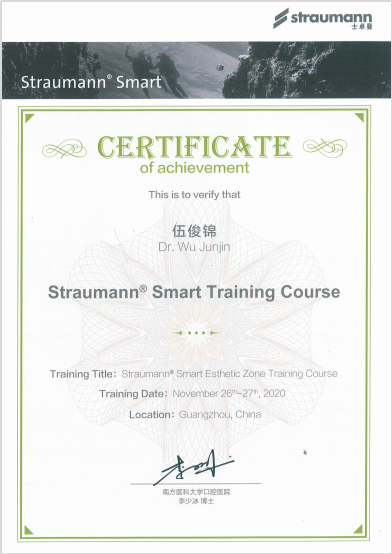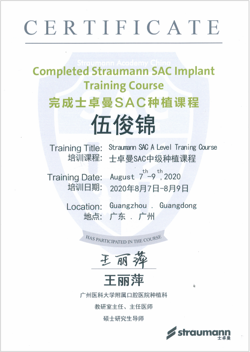 伍俊錦醫生,畢業于長沙醫學院口腔醫學專業,曾在佛山市暨南大學附屬口腔醫院口腔科實習,師從南方醫科大學口腔醫院種植科李少冰博士。曾參加北京口腔種植培訓學院(BITC)教育周培訓,士卓曼種植大師之路培訓并完成士卓曼SAC種植課程,以及口腔顯微根管治療四手操作培訓并完成系統規范化課程及實踐操作。多次受邀參加國內大型專業種植論壇會議,如第二屆粵港澳大灣區種植論壇暨第七次BITC口腔種植青年學者論壇、暨南大學口腔種植修復論壇等。